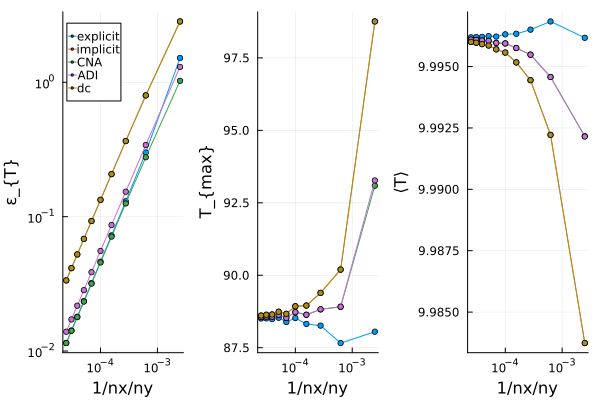 \[\begin{equation} \frac{T_{i,j}^{n+1/2}-T_{i,j}^n}{\Delta t/2} = \kappa \left( \frac{T_{i-1,j}^n-2T_{i,j}^n+T_{i+1,j}^n}{\Delta x^2} + \frac{T_{i,j-1}^{n+1/2}-2T_{i,j}^{n+1/2}+T_{i,j+1}^{n+1/2}}{\Delta y^2} \right) \end{equation}\] \[\begin{equation} \frac{T_{i,j}^{n+1}-T_{i,j}^{n+1/2}}{\Delta t/2} = \kappa \left( \frac{T_{i-1,j}^{n+1}-2T_{i,j}^{n+1}+T_{i+1,j}^{n+1}}{\Delta x^2} + \frac{T_{i,j-1}^{n+1/2}-2T_{i,j}^{n+1/2}+T_{i,j+1}^{n+1/2}}{\Delta y^2} \right) \end{equation}\]This results in two linear sets of linear system of euqations with coefficient matrices for the left and right hand side of the equations. The corresponding coefficients and right hand side of each linear system of equations needs to be adjusted according to the given boundary conditions, as shown in the CNA, for example. For more details on how this is implemented, see ADI.jl.