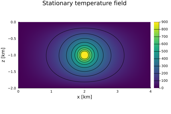 \[\begin{equation} \frac{T_{i,j}^{n+1} - T_{i,j}^{n} }{\Delta t} = \kappa \left( \frac{T_{i-1,j}^{n} - 2T_{i,j}^{n} + T_{i+1,j}^{n}}{\Delta{x}^2} + \frac{T_{i,j-1}^{n} - 2T_{i,j}^{n} + T_{i,j+1}^{n}}{\Delta{z^2}} \right) + \frac{Q_{i,j}^n}{\rho c_p} \end{equation}\]where i and j are the horizontal and vertical index of the numerical finite difference grid, n is the time step index, Δt is the time step, and Δx and Δy are the horizontal and vertical grid resolution, respectively. Equation $(5)$ contains know and unknow parameters and one can rearrange them to solve the equation for the unknowns as: